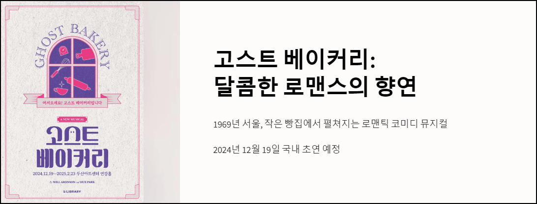 1969년 서울, 작은 빵집에서 펼쳐지는 로맨틱 코미디 뮤지컬 <고스트 베이커리>가 2024년 12월 19일에 국내 초연을 앞두고 있습니다. 이 작품은 베이커리를 배경으로 한 독특한 설정과 사랑스러운 캐릭터들로 관객의 마음을 사로잡을 준비를 하고 있습니다.