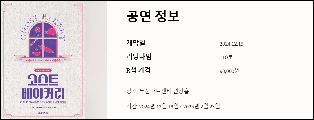 뮤지컬 <고스트 베이커리>는 두산아트센터 연강홀에서 2024년 12월 19일부터 2025년 2월 23일까지 공연됩니다. 다양한 공연 시간과 할인 혜택으로 관객을 맞이할 예정이니 관람 계획에 참고하세요.