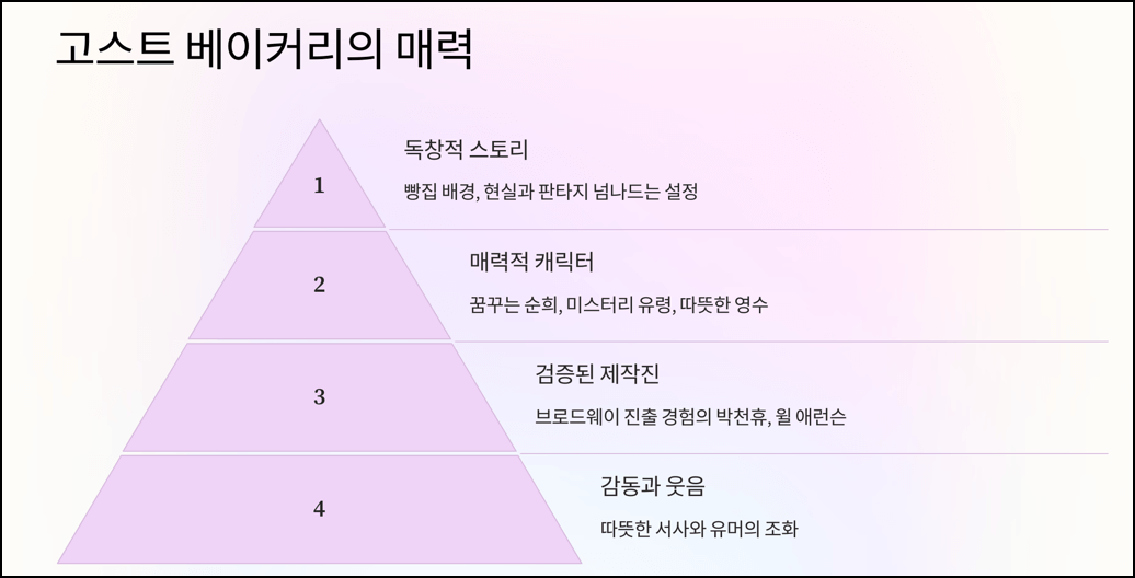<고스트 베이커리>는 단순히 로맨틱 코미디로 끝나지 않습니다. 이 작품의 매력 포인트는 다음과 같습니다.