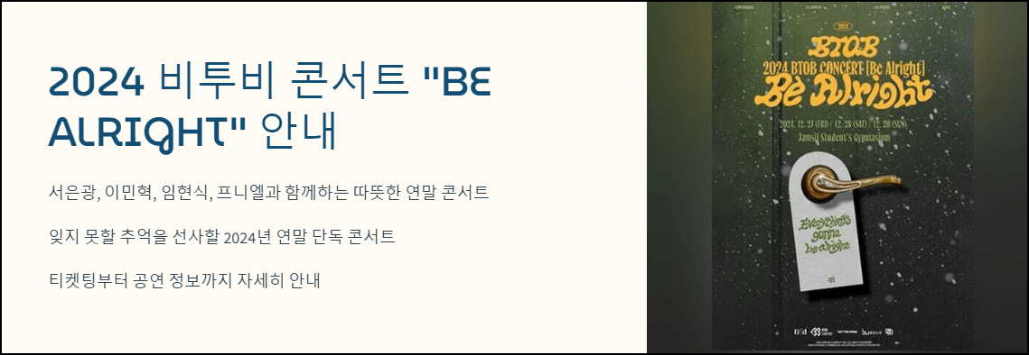 2024년 연말, 비투비의 단독 콘서트 "BE ALRIGHT"가 팬들을 찾아옵니다! 서은광, 이민혁, 임현식, 프니엘 네 멤버가 함께하는 이번 공연은 따뜻한 연말을 맞아 잊지 못할 추억을 선사할 예정인데요. 티켓팅부터 공연 정보까지 자세히 정리해 보았습니다.