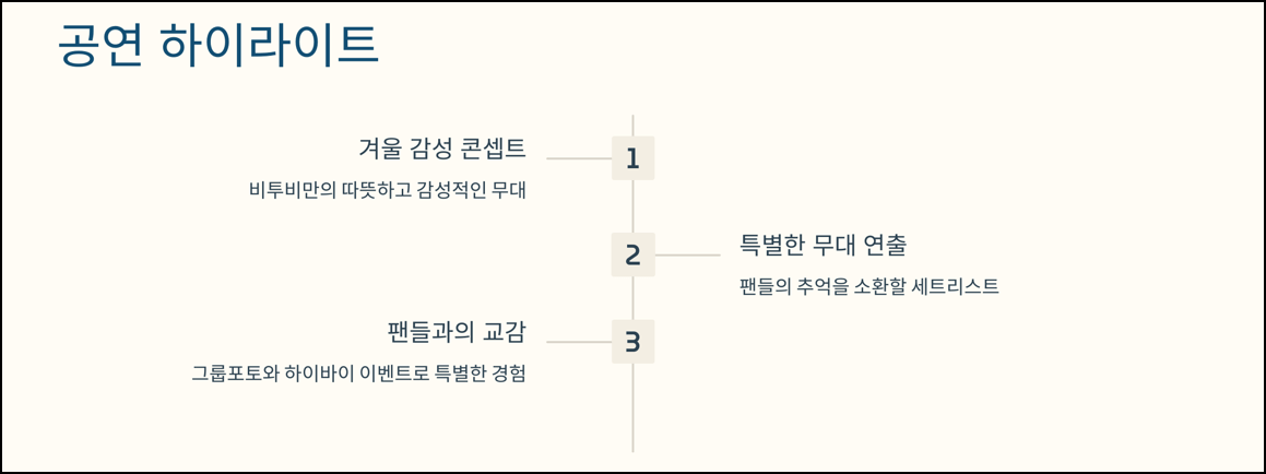 - 겨울 감성 콘셉트: 비투비만의 따뜻하고 감성적인 무대가 펼쳐질 예정입니다.