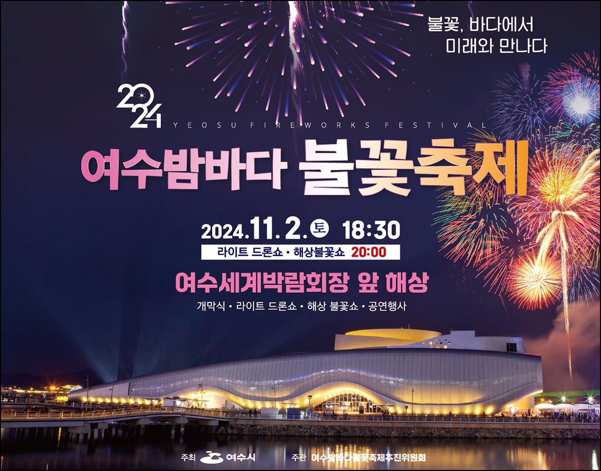 여수의 아름다운 밤바다를 배경으로 펼쳐지는 '2024 여수밤바다 불꽃축제'가 11월 2일에 성대하게 열립니다. 이 축제는 매년 수많은 방문객들을 매료시키는 여수의 대표적인 행사로, 바다와 하늘을 배경으로 한 화려한 불꽃놀이가 밤하늘을 장식합니다.
